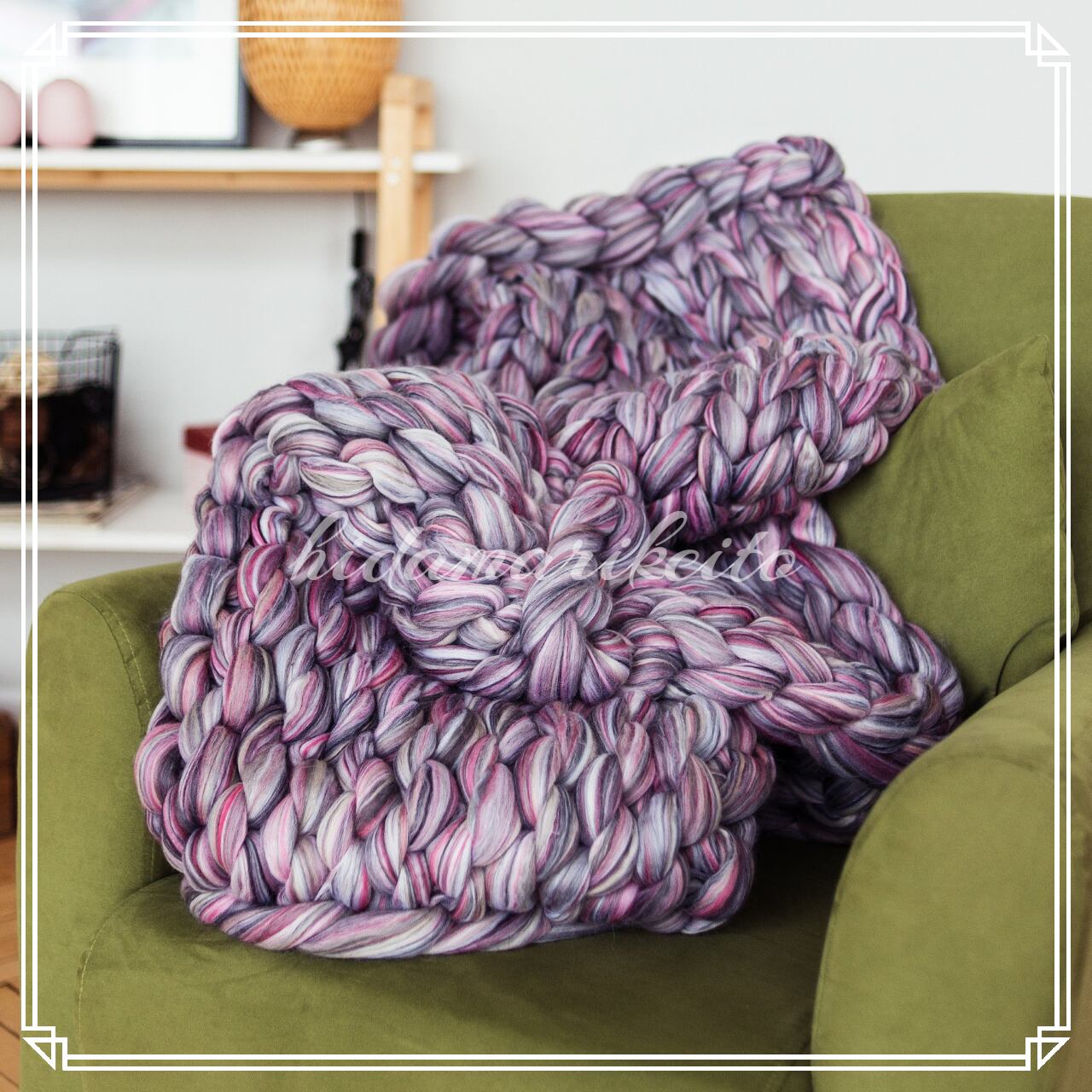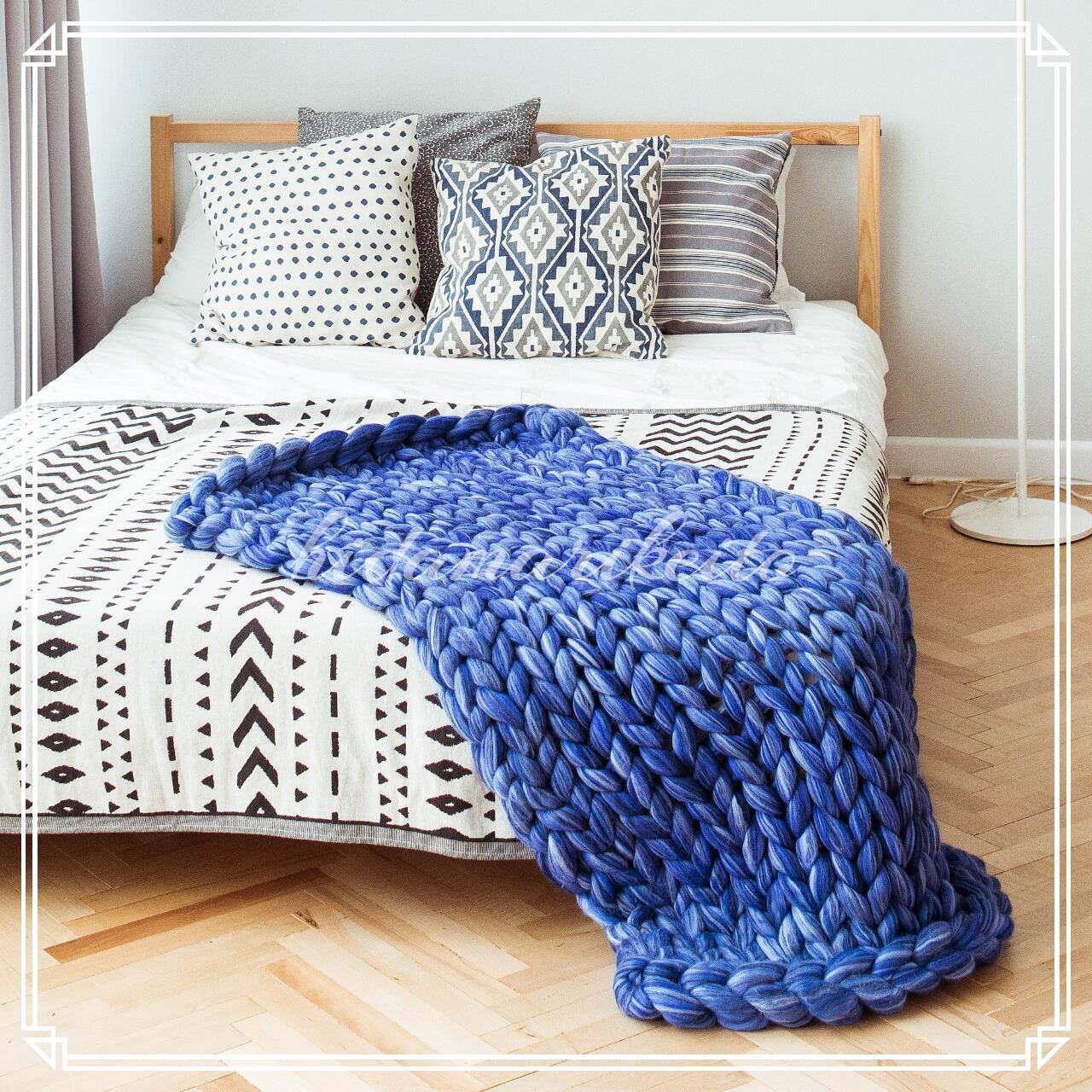 海外インテリア好きさんの間で大流行中の超極太毛糸、チャンキーニットで編んだブランケットです。