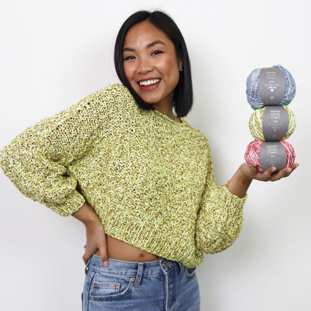 ベースはリサイクルコットンを使用しており、細身のブークレ糸を使用することで、波打つような楽しい現代的なデザインに仕上がっています。
